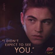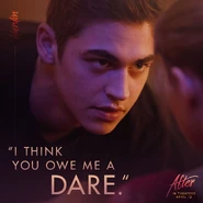 The group plays a game of truth or dare where Tessa is dared to make out with Hardin, though she shuts him down claiming that she is over the stupid game. She abruptly leaves earning surprised murmurs from his group of friends who claim this is Hardin's first rejection. She wanders through the house and into a room where she admires a book collection. She is promptly surprised when Hardin enters saying that this is his room. They share a moment where their hands linger and they seem to have a connection. Tessa stops herself before anything happens and promptly leaves the party. She takes a call from Noah and he reprimands her for attending a party so she hangs up on him and leaves. When she returns to her dorm she reads messages from both Noah and her mother, who is unhappy upon hearing that Tessa attended a party.