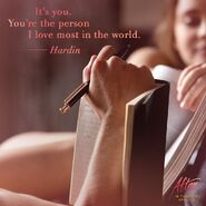 Tessa and Landon sit on the campus lawn now that class is dismissed. She opens the packet and notices a photograph of a lake and a portrait photo of her. He asks what the lake is supposed to mean, but she merely responds that it's a special place. She reads the letter that surprisingly is a letter from Hardin professing his feelings for her. He explains that she once asked him who he loves most in the world, and now he knows that it's her. Hardin sits at the end of the dock by the lake when Tessa arrives and sits next to him. She looks over at him and he returns her gaze.