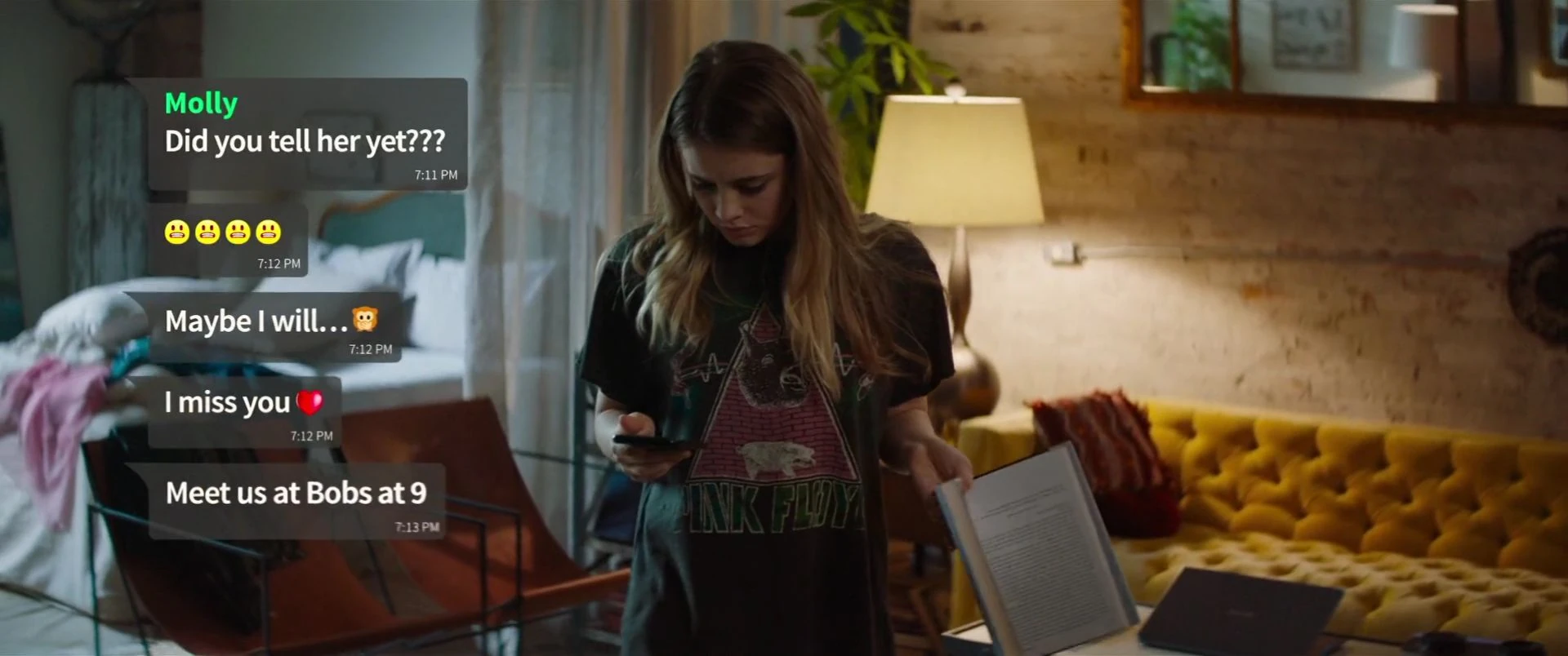 One night, Tessa is attempting to read when Hardin's phone continues to chime with messages from someone. She picks it up to turn the chime off when she discovers a slew of messages from Molly wanting to meet with him and talking about something going on. This sparks Tessa's jealousy and concern so she confronts Hardin about the messages. He brushes her off and begins to leave when she stops him, asking him to explain. He pauses then asks if she trusts him, which she responds that she does, so he doesn't see the problem. He leaves abruptly after leaving her confused and annoyed.